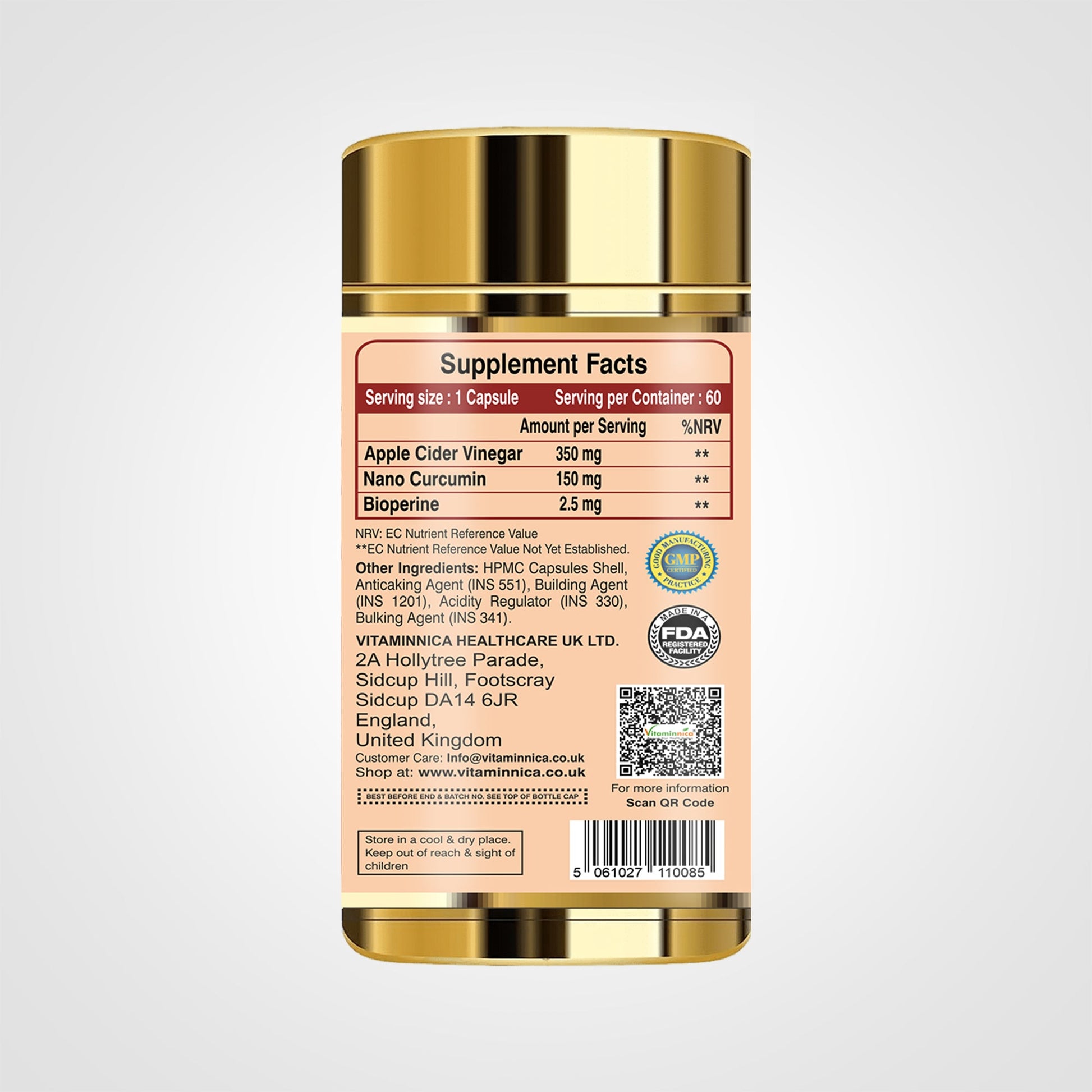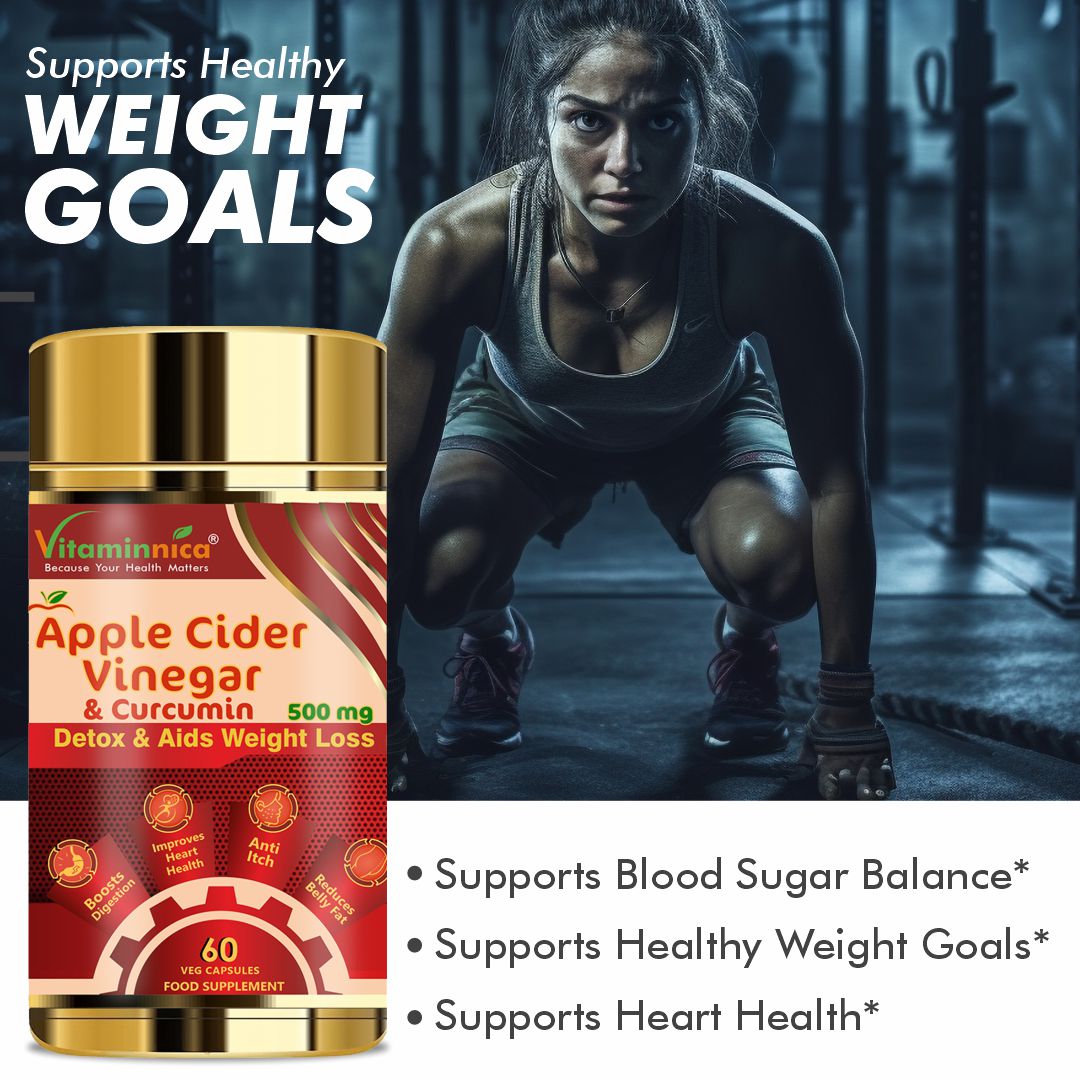 Vitaminnica Apple Cider Vinegar + Curcumin capsules are food supplements which is a part of your daily nourishment to improve your gut health and overall digestion. Apple cider vinegar is a vinegar made from the made from crushed apples that undergo a fermentation process to produce acetic acid. Vitaminnica Apple cider vinegar with curcumin helps cleanse the body by supporting the liver's natural detoxification processes.