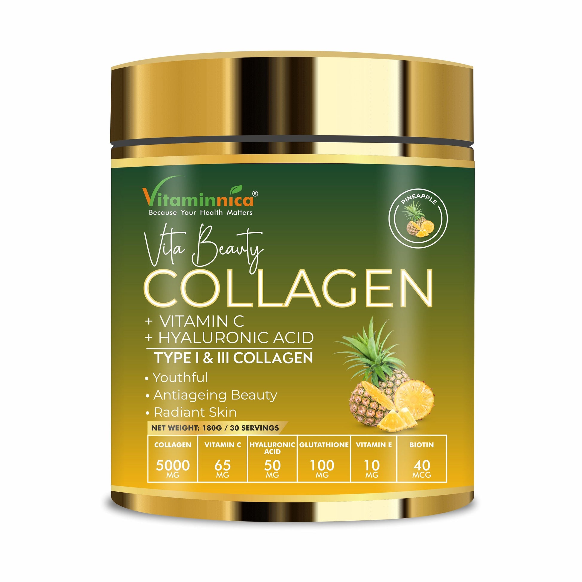 Vitaminnica Vita Beauty Premium Bovine Collagen Powder (Type I & III) with Hyaluronic Acid, Glutathione, Vitamin C, Biotin & Vitamin E | For Glowing Skin & Anti-Aging - 30 servings