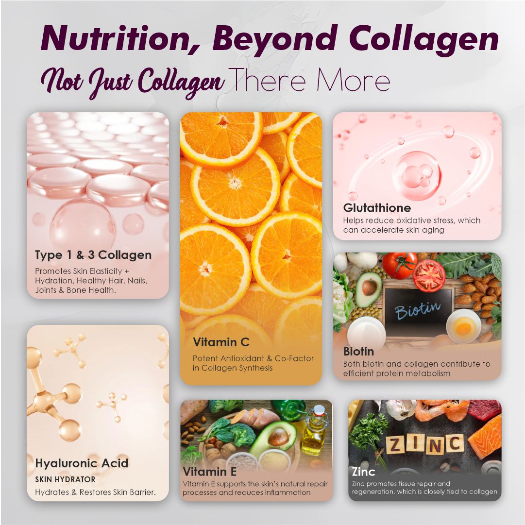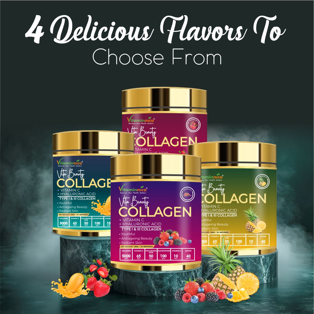 Vitaminnica Collagen Powder is a unique blend for skin health that all together supports youthful and glowing skin. This blend enhances skin elasticity & supports uneven complexion. Good collagen helps to improve the nails appearance and also increases the strength of nails by preventing and stimulating their growth. Collagen helps increase bone mineral density by stimulating bone production and inhibiting bone loss. It helps reduce dullness, marks & pigmentation in the skin. It rejuvenates & regenerates the skin cells.