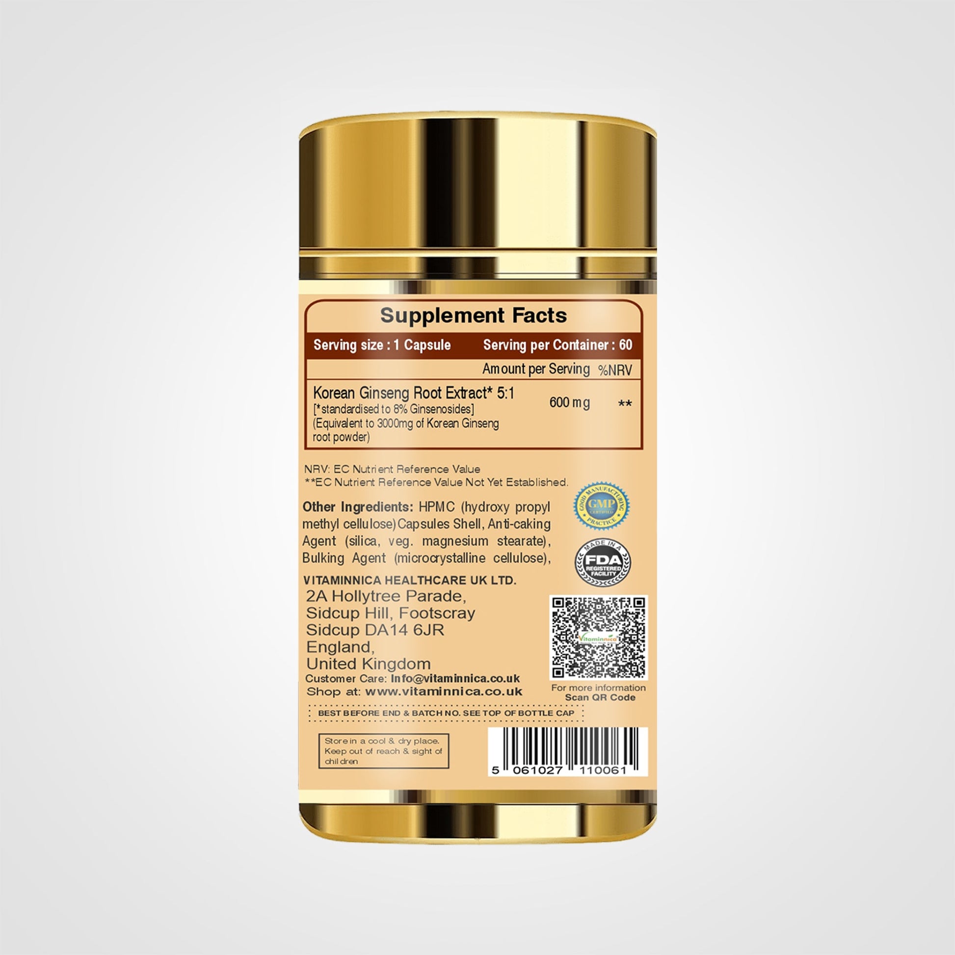 Vitaminnica Korean Ginseng also known as Panax ginseng, is a dietary supplement that helps improve physical performance and supports the body's natural defense systems. Korean Ginseng helps to reduce inflammatory markers and protects against oxidative stress. It elevates your energy levels and keeps you energized all day. Vitaminnica Korean Ginseng improves overall health and strengthens the immune system. It helps fight off stress and disease. Our capsules may improve symptoms of erectile dysfunction by decreasing oxidative stress in tissues and enhancing blood flow in penile muscles. It also helps in the improvement of cognitive performance, mainly short-term memory.