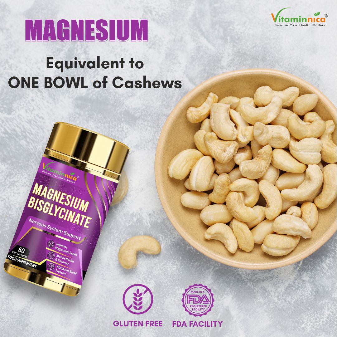 Magnesium Bisglycinate is a mineral supplement primarily used to manage nutritional deficiencies. It is required for the formation of protein, healthy teeth and bones, fatty acids, activating vitamin B, and supporting muscle activity. Vitaminnica Magnesium Bisglycinate capsules may helps increase magnesium levels, especially for individuals with low dietary intake. It can contribute to normal muscle function, muscle contraction along with relieve in muscle aches. It may support relaxation, reduce anxiety, and improve sleep quality.