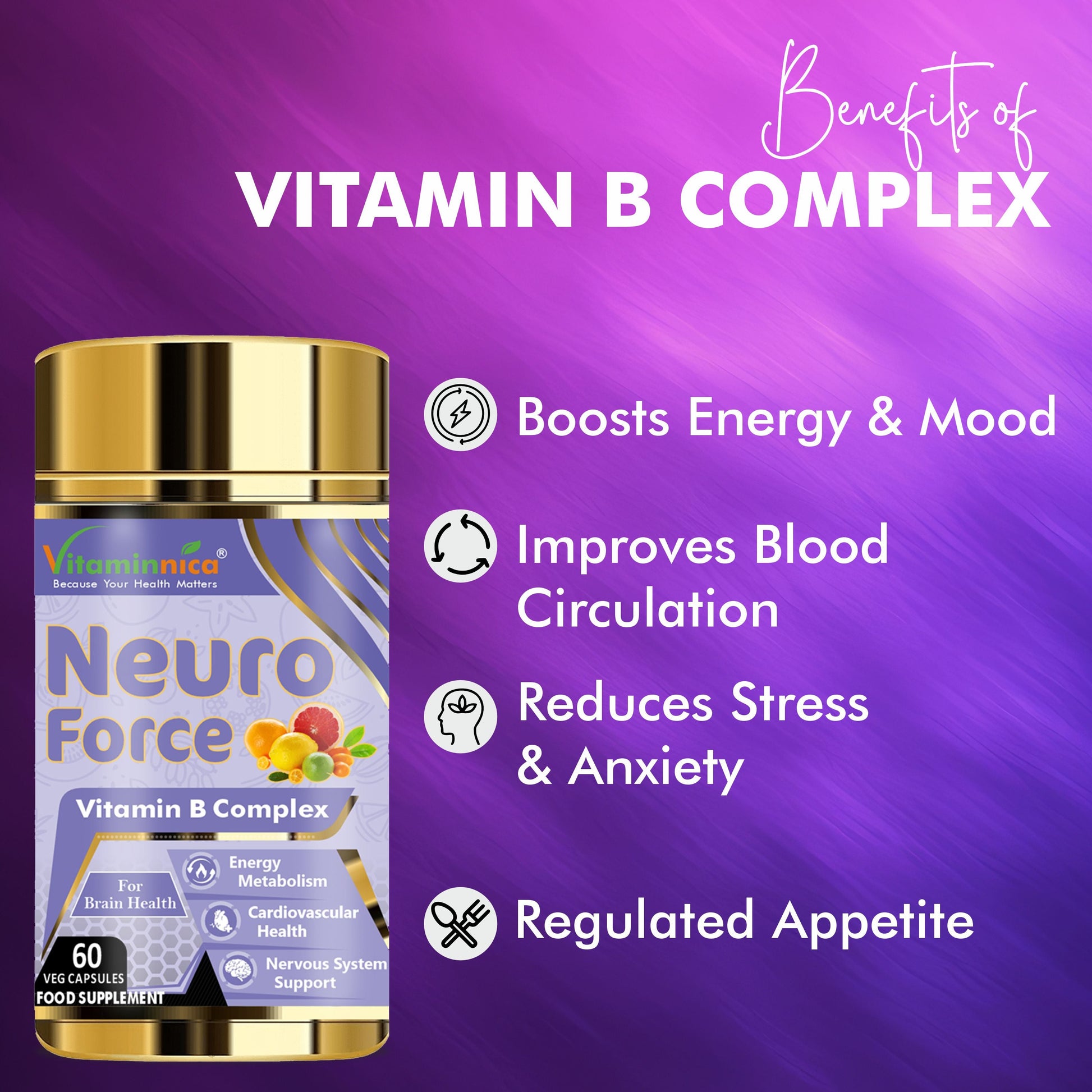 Vitaminnica Neuro-Force is a health product which helps to improve brain health and support daily cognitive wellness. It promotes brain wellness at every age. Vitaminnica Neuro Force plays an important role in keeping our bodies running like well-oiled machines. It helps promote a better mood and fights stress. Vitamin B Complex contains essential nutrients which help convert our food into fuel, allowing us to stay energized throughout the day. Vitaminnica Neuro Force capsules support the immune system and help the body in breaking down protein. It keeps energy levels high and contributes to cardiovascular health. Our capsules help in increasing long-term memory and revitalize your mind.