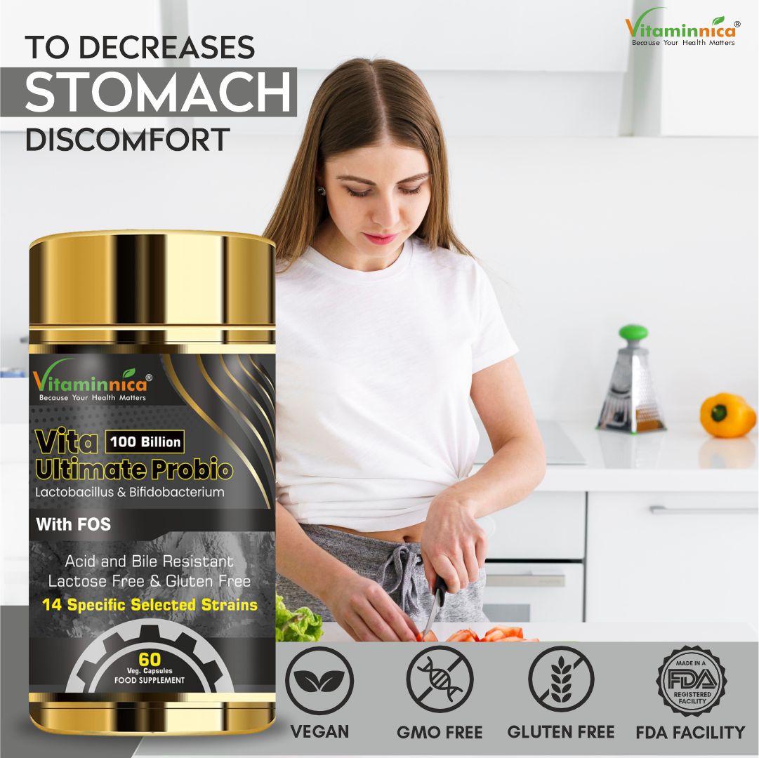 Vita Ultimate Probio with Lactobacillus and Bifidobacterium is used as a probiotic to maintain a healthy digestive tract. It is used in the people with irritable bowel syndrome. Vitaminnica Ultimate Probio may supports the immune system by enhancing the production of natural antibodies. It supports overall gut health and healthy balance of bacteria in the gut. Our capsules also prevents the overgrowth of harmful bacteria and may reduces the risk of vaginal infections.