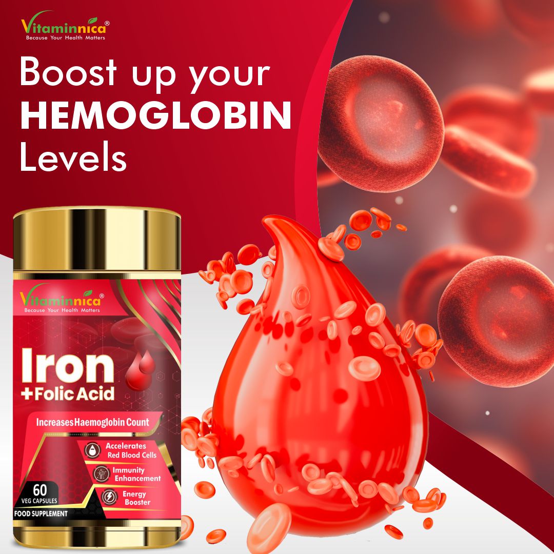 Vitaminnica Iron + Folic Acid capsules helps to increase heamoglobin with a reduced risk of iron deficiency and anemia, especially in pregnant women. Iron+Folic Acid contains a haematinics combination, which works by boosting the production of Red Blood Cells (RBC) and Haemoglobin in the body.