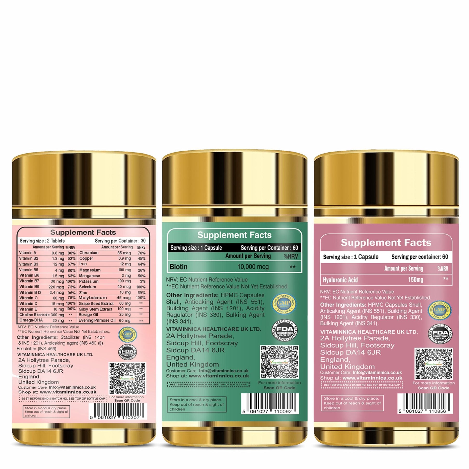 Women's Natural Beauty Bundle- Vitaminnica Multi Vita Women+ Biotin+ Hyaluronic Acid- 180 Capsules